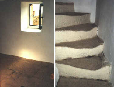 At the foot of the stairs, two doors open into large rooms on the ground floor of the house. The wall surrounding the smaller door on the left is plastered and freshly painted, concealing the structure of the door frame. But the stones framing the larger door on the right are exposed, and form a massive pillar on the right. Across the top of the door, large stones about four by eighteen inches on their ends, form a nearly straight edge above the door, only their beveled sides supporting the arch of the door. On the left, the framing stones have been beveled on the sides, and neatly scalloped at the top. Patrice explains later that this was to allow a carriage to be parked in the narrow covered area, and pulled out at an angle.